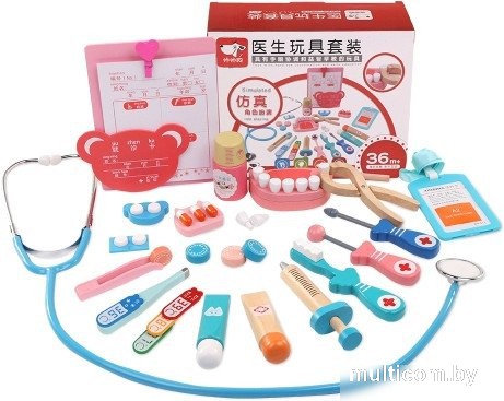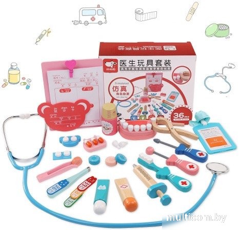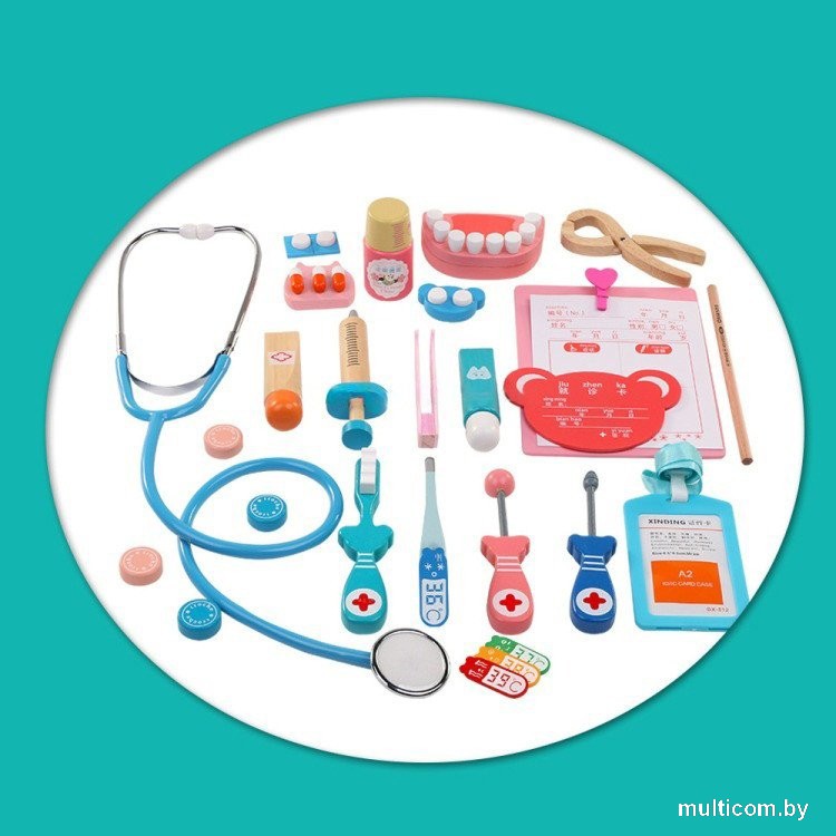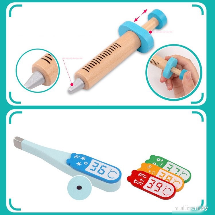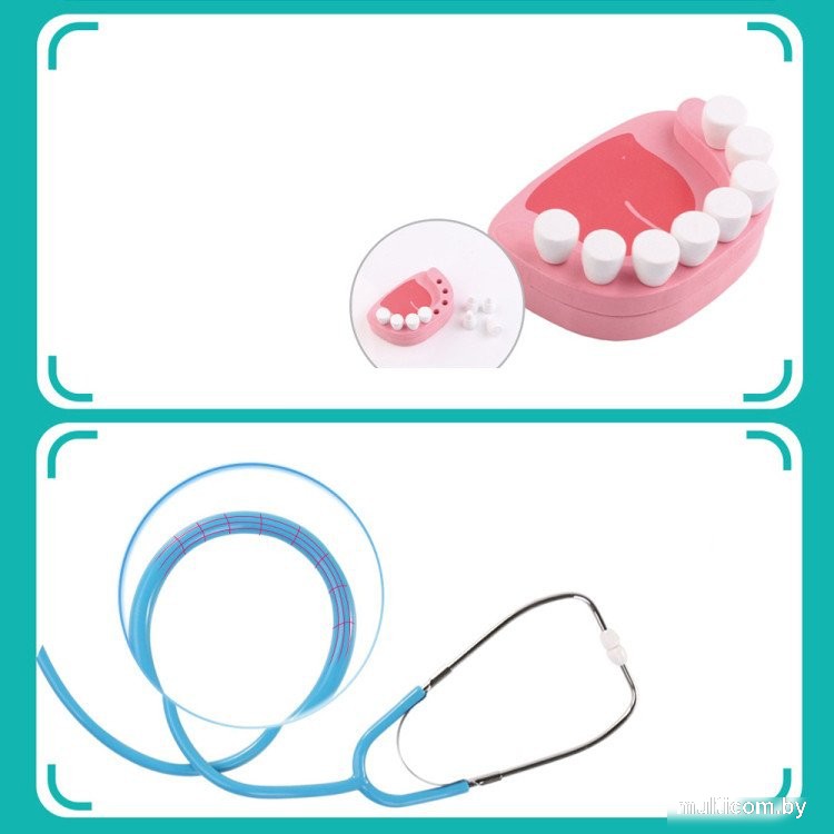 | Состав набора | шприц, пинцет, стетоскоп, щипцы, градусник, таблетки, банка, карточка пациента, челюсть, зубная щетка, карандаш, планшет для записей, зубная паста, грелка, тюбик, зубик |