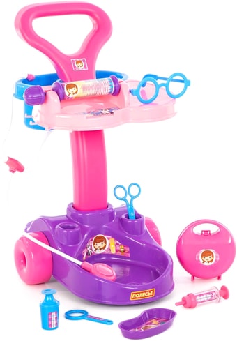 | Информация | Игровой набор «Доктор» включает в себя предметы, которые очень похожи на приспособления, имеющиеся в арсенале настоящих врачей. Среди них — стетоскоп, очки, шприц и множество других приборов. В наборе 9 элементов. Приборы можно перевозить на специальной тележке, которая отлично дополняет образ юного врача. |