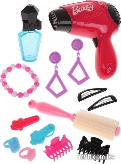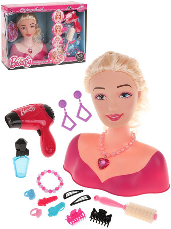 | Состав набора | электрифицированный фен (дует как настоящий при нажатии на кнопку), расческа, 6 заколок, флакончик, бусы с кулоном в виде сердца, а также пара сережек на клипсах, браслетик из бусин и 2 колечка для девочки |