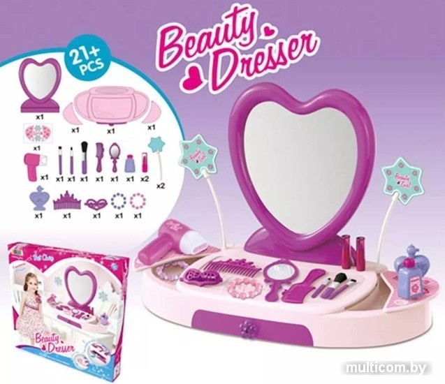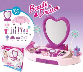 | Состав набора | 3 кисти, основа туалетного столика, большое зеркало в форме сердца (устанавливается поверх основы), маленькое зеркальце с ручкой, фен, расчёска, тюбик, 2 муляжа помады, 2 декоративные звёздочки, флакончик, гребень, заколка, 2 браслетика, а также лист с декоративными наклейками. |