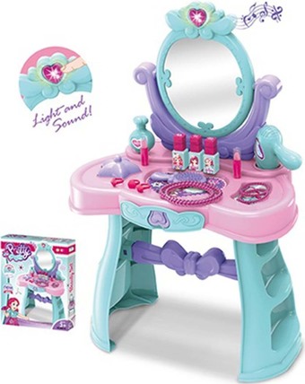 | Состав набора | туалетный столик с зеркальцем, фен, флакончик, 2 муляжа помады, 3 муляжа лака, 2 бус, 2 браслетика, расчёска и 3 колечка. |