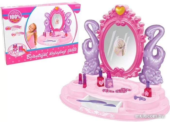 | Состав набора | туалетный столик с зеркальцем, 3 муляжа лака, 3 муляжа помады, 3 браслета, 2 кольца, гребень, расческа, набор наклеек. |