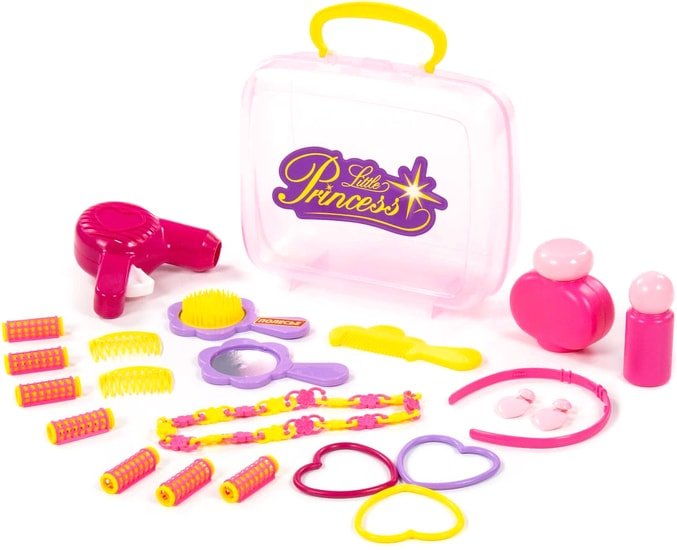 | Состав набора | ожерелье (1 шт), браслет (3 шт), расческа (4 шт), бигуди (7 шт), чемоданчик, зеркало ручное (1 шт), клипсы (1 пара), обруч для волос (1 шт), игрушечный флакон (2 шт) |