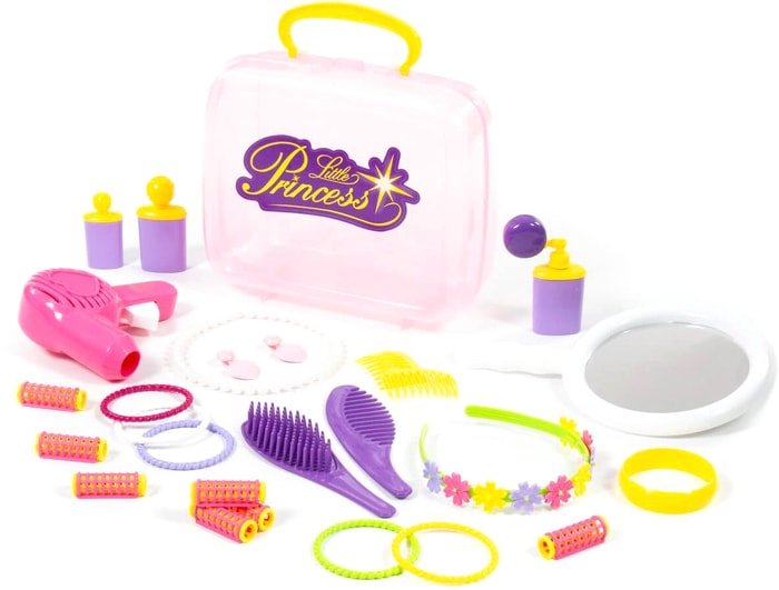 | Состав набора | ожерелье (1 шт), браслет (1 шт), расческа (4 шт), бигуди (7 шт), чемоданчик, зеркало ручное (1 шт), клипсы (1 пара), обруч для волос (1 шт), игрушечный флакон (3 шт) |