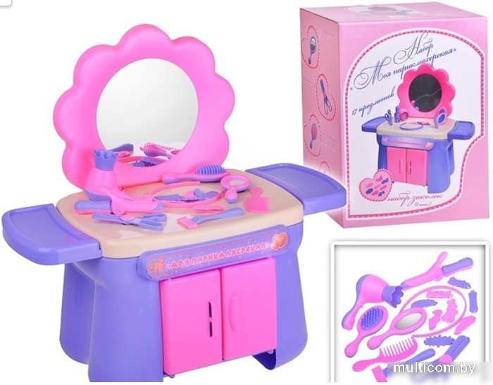 | Состав набора | стол, расческа, ножницы, плойка, бритвенный станок, фен, ободок, заколка 8 шт., массажная расческа, зеркало |