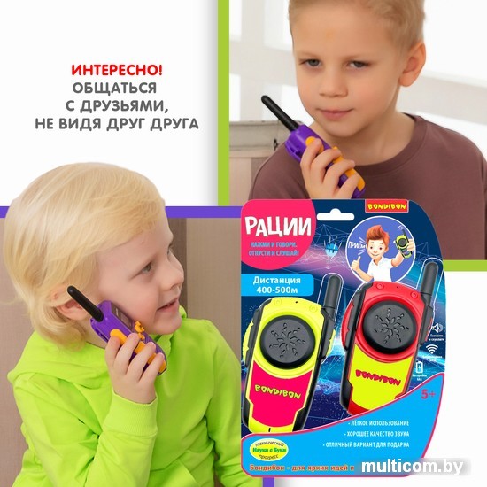 | Информация | Первый, первый, я - второй. На связи! Вы всегда будете на связи с веселыми рациями по типу walkie talkie от Bondibon! С помощью рации ребенок погрузится в захватывающую игру целиком, сможет держать связь с другом на расстоянии, решать необходимые задачи не приближаясь друг другу. С такой игрушкой дети весело проведут время, играя в прятки, шпионские игры или проходя с друзьями квесты. Активные ролевые игры отвлекут ребенка от сидения с планшетом или телефоном, подарят хорошее настроение, помогут в развитии коммуникативных навыков и фантазии. Играть просто! Нажми кнопку на рации и говори. Затем отпусти кнопку и слушай! Отличная связь на дистанции 400-500 метров, удобный диапазон частот 446,0 МГц, 1 канал. |