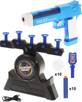 | Информация | Игровой набор «Стрелок» включает пистолет, 10 софт-патронов с наконечниками-присосками, а также электрифицированную мишень-основание, 10 шариков и 5 столбиков – всего 2 вида мишени для стрельбы. Стрелять можно как по шарикам, так и по столбикам. Перед игрой необходимо установить на мишень-основание либо шарики с соответствующими трубками, либо столбики. Во время игры за счет подачи воздуха шарики «парят» над основанием. Как стрелять. Установите софт-патрон в ствол пистолета. Потяните на себя подвижную часть корпуса оружия до щелчка, прицельтесь и нажмите на спусковой крючок. Мишень работает от 4-х батареек типа АА на 1,5 V (не входят в комплект) или через USB-кабель (входит в комплект). |