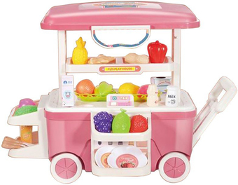 | Состав набора | 28 предметов, среди них ребенок найдет основу для магазинного прилавка (изначально идет в виде чемоданчика), 4 коробочки с изображением продуктов, 2 баночки, арахис, красный перец, имбирь, горошек, виноград, капусту, лайм, драконов фрукт, ананас, апельсин, клубнику, сливу, 4 тарелки, лопатку с перфорацией, ухват, ложку, безопасный ножик и монеты |