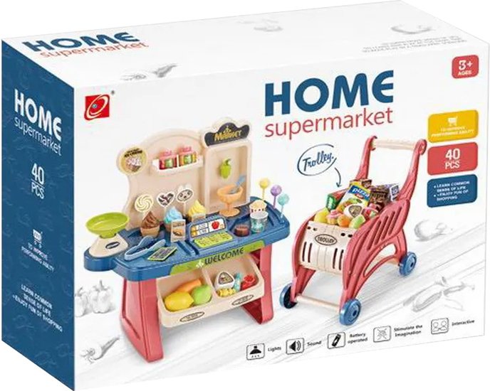 | Информация | Игровой набор имитирует профессиональный, современный супермаркет с кассой и, безусловно, будет идеальным подарком для ребенка. Супермаркет имеет множество дополнительных аксессуаров, таких как: кассовый аппарат, который имеет световое и звуковое сопровождение; весы; тележка на колесиках; фрукты; овощи; различные продукты. Кроме того, в распоряжении имеется тележка для покупок, благодаря чему в магазин может сыграть несколько детей. |
