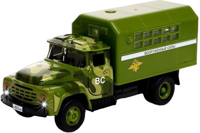 | Информация | Лицензионная модель ЗИЛ — детально проработанный военный транспорт. Машинка дополнит игрушечный автопарк и станет прекрасным подарком для маленького любителя техники. Особенности:Машинка точно детализирована: выштамповка кузова, навесные элементы и др. Встроен инерционный механизм. Он позволяет задать транспорту скорость и дает возможность двигаться самостоятельно, по инерции. Грузовик имеет звуковые эффекты: воспроизводит звук клаксона, запуск двигателя и фразы на русском языке. Открываются двери кабины и кузова. Поднимается капот. Двигатель светится красным. Фары светятся бело-голубым. Список фраз: «Привет!», «Ну что, поехали?», «Куда вас подвезти?», «Эх, прокачу». |