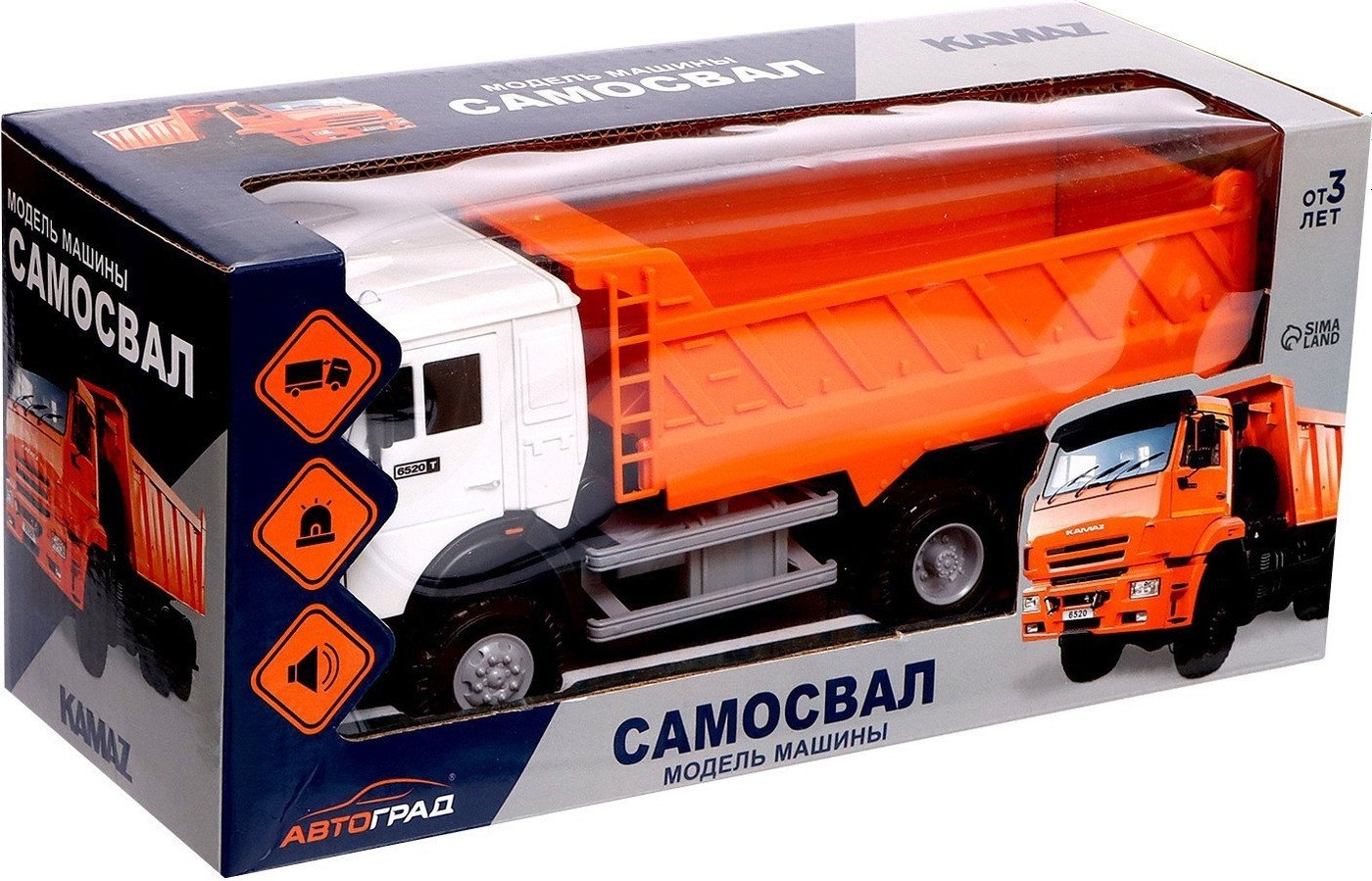 | Информация | - Лицензионная модель КамАЗ — детально проработанный спецтранспорт в виде самосвала. Машинка дополнит игрушечный автопарк и станет прекрасным подарком для маленького любителя техники. - Особенности модели: - Модель полностью выполнена из пластика. - Машинка точно детализирована: выштамповка кузова, навесные элементы и др. - Встроен инерционный механизм, позволяющий транспорту двигаться самостоятельно, по инерции. - Грузовик имеет звуковые эффекты: воспроизводит звуки ускорения, клаксона и сигнализации. - Открываются двери кабины. Кабина откидывается. Кузов поднимается. - Звуковые эффекты срабатывают при открывании дверей. Для работы требуется 3 батарейки типоразмера LR44 (входят в комплект). |