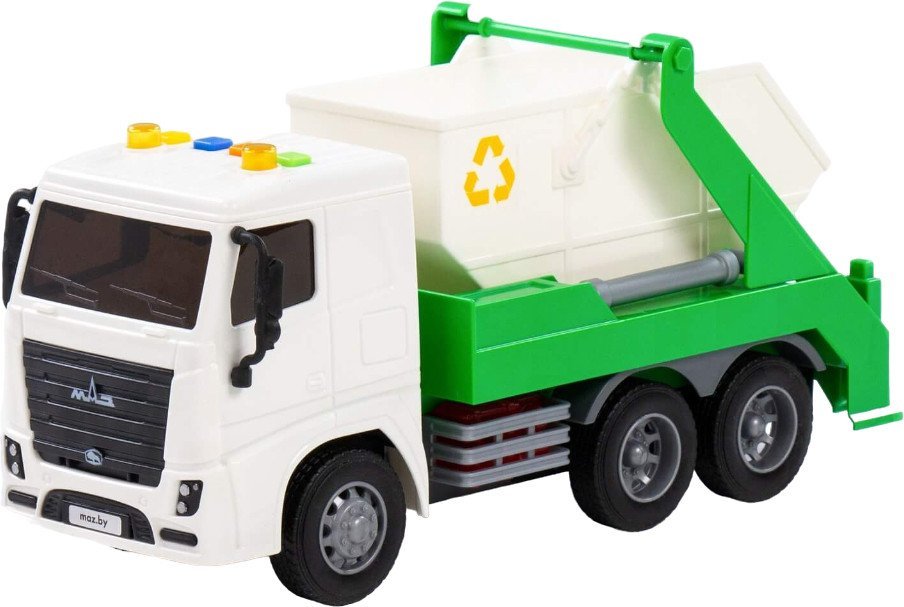 | Информация | Автомобиль-контейнеровоз изготовлен по лицнензии Минского автомобильного завода МАЗ. Данный вид спецтехники предназначен для транспортировки твердых коммунальных отходов. Игрушка многофункциональная: имеет подвижные элементы и оснащена съёмным контейнером. На кабине имеется 4 кнопки управления звуковыми и световыми сигналами. Машинка оснащёна инерционным механизмом. |