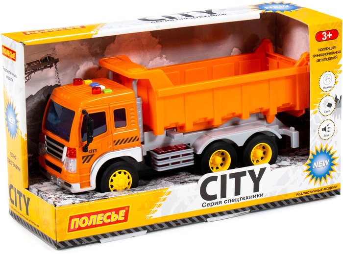 | Информация | Автомобиль-самосвал инерционный «Сити» от фабрики «Полесье» - это качественная реалистичная игрушка, конструкция которой полностью повторяет дизайн настоящей техники. Спецмашина имеет три пары колёс на металлических осях, кроме того, она оснащена подвижным кузовом, который позволит придумывать различные сценарии игры. На кабине авто имеется 4 кнопки управления звуковыми и световыми эффектами. |
