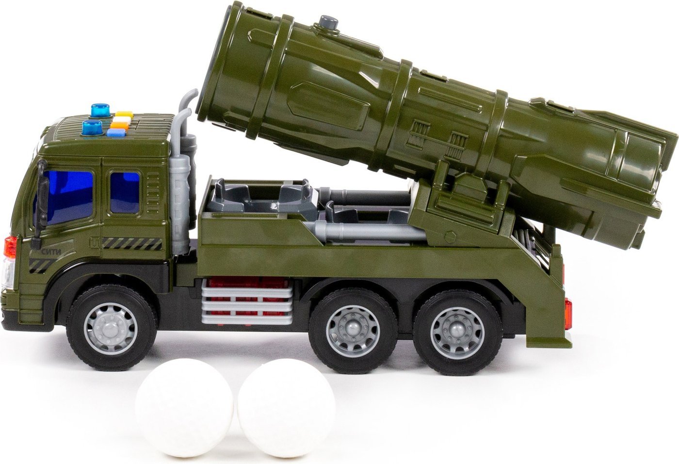 | Информация | - Автомобиль из серии «Сити» с зенитно-ракетной установкой станет настоящим хитом среди игрушек вашего ребенка. - Ствол установки можно регулировать, что позволяет стрелять под разными углами. В комплект входят два шарика, которые служат в качестве «снарядов». - Чтобы сделать «выстрел», просто выберите нужный угол, поместите шарик и нажмите на серую кнопку. - Игрушка оснащена инерционным механизмом и имеет прорезиненные колеса для удобства игры. - На кабине расположены 4 кнопки, которые активируют звуковые и световые эффекты, добавляя веселья в игру. - Для безопасности детей боковые зеркала автомобиля выполнены из резины. - Игрушка продается в красивой коробке, что делает ее отличным подарком! |