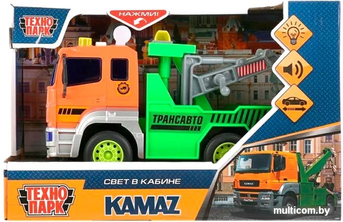 | Информация | Инерционная пластиковая модель «Камаз. Эвакуатор» ТМ «Технопарк» - великолепный подарок для мальчика: - звуковые эффекты - свет в кабине - инерционный механизм (потяните машину назад, отпустите - и она тут же поедет вперёд) Машина выглядит в точности, как её оригинал и, без всяких сомнений, займёт достойное место в коллекции маленького автолюбителя. Благодаря её грузовому классу, эта машина открывает больше возможностей и сценариев для весёлых игр. Машинку удобно брать с собой и играть абсолютно везде! |