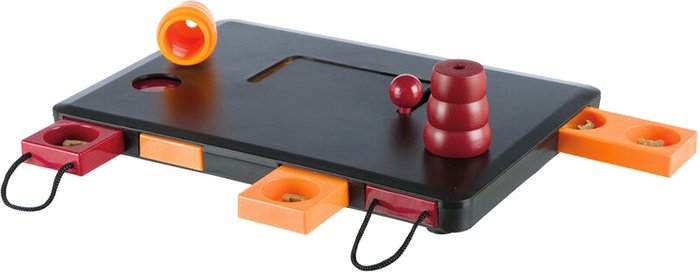 | Информация | Собака открывая ящики с помощь петель и путем толкания ползунка получает угощения, игра с 2 шаровидными крышками и различными углублениями и ящиками, использование конусов в качестве пробок повышает уровень сложности, материал: пластик, отсутствие скольжения из-за резиновых ног у основания игрушки, в комплекте буклет с советами и приемами для разработки оптимального обучения. |