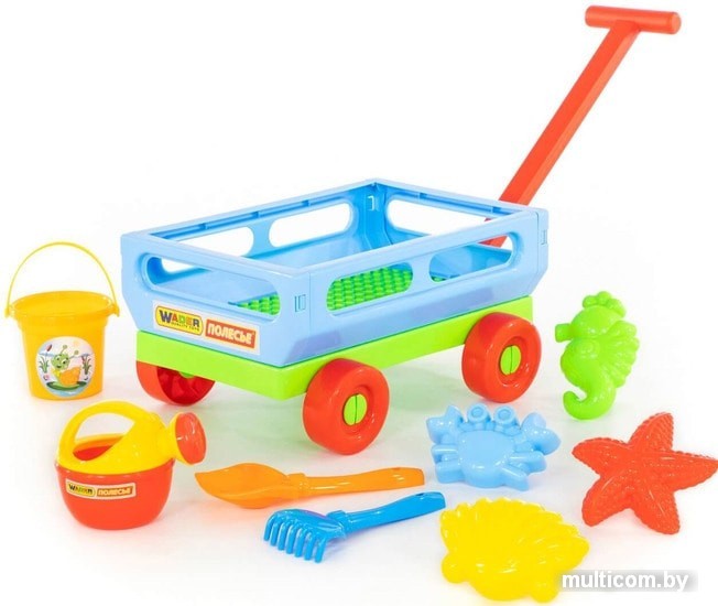 | Информация | Тележка, в наборе с которой идёт: ведро малое, лопатка № 5, грабельки № 5, формочки (краб № 1 + морской конёк + морская звезда № 1 + ракушка № 1), лейка № 4, отлично подойдёт для игр в песочнице и дома. В ней будет удобно хранить и перевозить другие игрушки. Конструкция тележки предполагает наличие 4- колёс, также для удобства перемещения предусмотрена ручка. Все игрушки представлены в яркой расцветке. Они дополнят игру, сделают её ещё интереснее. |