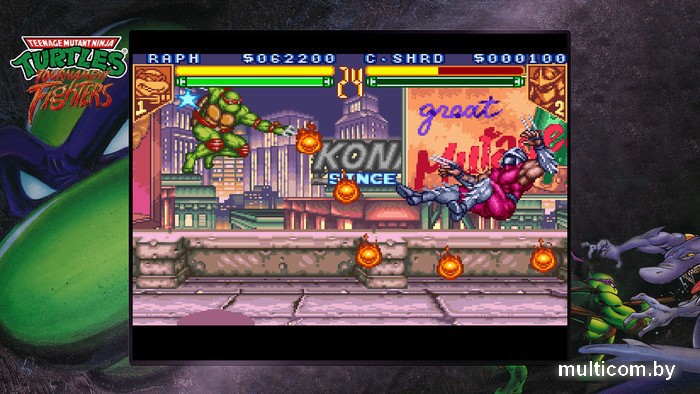 | Информация | Teenage Mutant Ninja Turtles: The Cowabunga Collection — это невероятный набор из тринадцати классических игр о черепашках-ниндзя от Konami. Данная коллекция даёт игрокам уникальную возможность насладиться этими крайне популярными и знаковыми для своих жанров играми с фантастическим набором новых функций и материалов: совместное локальное прохождение и игры по сети*, сохранения и обратная перемотка в любой момент, одиннадцать версий игр для японского региона, переназначения кнопок, уникальные эскизы и рисунки от разработчиков, исторические медиаматериалы вселенной черепашек-ниндзя. Игры созданы на основе серии комиксов и мультсериала 1980-х годов «Черепашки-ниндзя» (The Teenage Mutant Ninja Turtles). Действие многих игр из коллекции происходит на разных локациях: в художественно переосмысленном Нью-Йорке, в канализации, на футуристических вражеских базах и даже в ходе перемещений во времени! *Игры с сетевыми компонентами: TMNT (аркада) TMNT Turtles in Time TMNT The Hyperstone Heist TMNT Tournament Fighters |