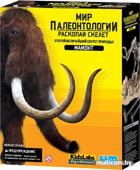 | Состав набора | - Гипсовый брикет (с костями мамонта внутри) - Молоточек со скребком - Зубило - Кисточка - Мягкий воск для соединения костей скелета - Поддон (из бумаги) - Инструкция на русском языке |