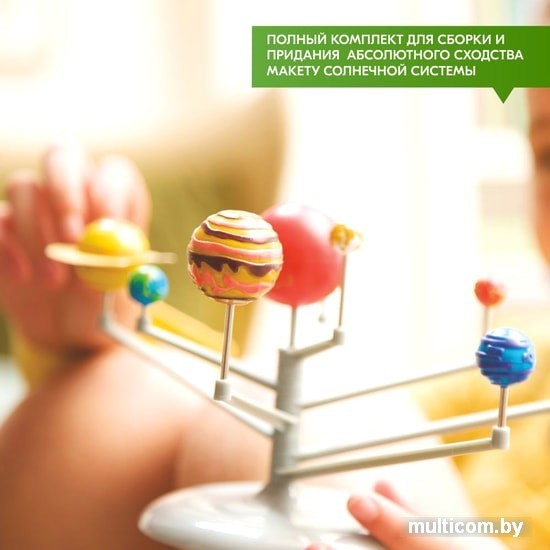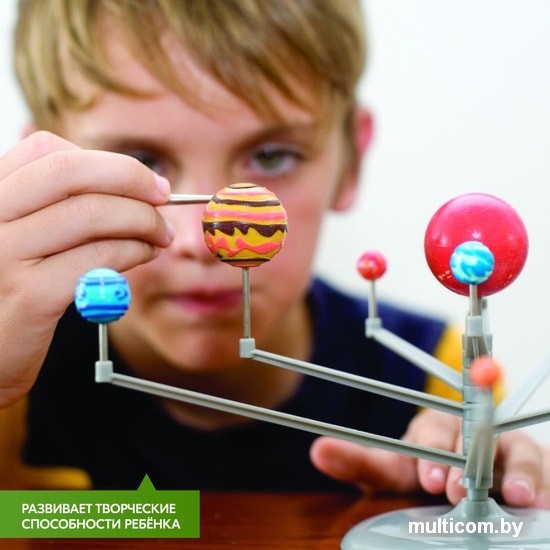 | Информация | Тем, кто хоть раз был в планетарии, никогда не забыть бесконечно красивое кружение планет. Это зрелище настолько завораживает и впечатляет, что невозможно отвести глаз. А хотите устроить планетарий у себя дома? И воочию увидеть, как планеты вращаются вокруг Солнца? Тогда вас и вашего ребенка заинтересует набор «Солнечная система» от 4М. С его помощью вы соберете трехмерную модель нашей Солнечной системы, состоящую из 8 планет и центральной звезды — Солнца. Планеты можно вращать по орбитам вокруг светила. Раскрасьте макет флуоресцентным краскам из набора. Благодаря им планеты приобретут невероятную реалистичность и будут мерцать в темноте. Потушите свет и наслаждайтесь выразительными красотами вселенной! Узнайте больше о строении Солнечной системы из познавательной инструкции. В ней вы найдете сведения о массе каждой планеты, количестве спутников и времени вращения по орбите. Набор «Солнечная система» — прекрасный научный проект, предназначенный для знакомства ребенка с основами астрономии. Он расширяет представления об окружающем мире и стимулирует любознательность. Помимо обучающего компонента, в нем сильно творческое начало. Ведь макет требует сборки и художественного оформления. И, несомненно, объемная модель Солнечной системы украсит интерьер комнаты, став его изюминкой. |