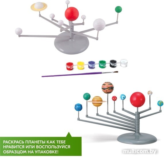 | Состав набора | Трехмерная модель Солнечной системы Подставка для макета Кисточка 6 красок разных цветов Флуоресцентная краска 9 стержней для планет Наждачная бумага Шаблон колец Сатурна Подробная инструкция с настенной схемой Солнечной системы |