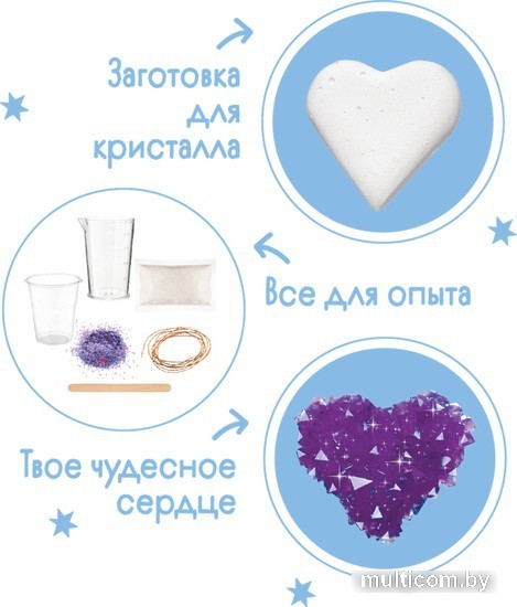 | Информация | Выращивание кристаллов – это отличная возможность не только понаблюдать за чудесами окружающего мира, но и сотворить их самому! С набором «Кристаллы:Чудесное сердце» вы сможете изготовить сияющий фигурный кристалл в форме фиолетового сердца. Кристальная фигурка станет как отличным украшением для комнаты, так и необычным подарком. В заготовке есть специальное отверстие, поэтому готовым кристаллом можно будет украсить комнату или повесить его на елку. Создать фигурный кристалл совсем несложно. В наборе есть все необходимое для безопасного опыта, а также подробная инструкция на русском языке. Для того чтобы создать чудесное сердце вам нужно приготовить раствор, следуя инструкции, затем опустить туда гипсовую заготовку и подождать. Уже через три часа у вас получится прочный фигурный кристалл, который будет радовать вас очень долго. Наслаждайтесь результатом. Таинственное фиолетовое сердце станет как отличным украшением для комнаты, так и необычным подарком. |