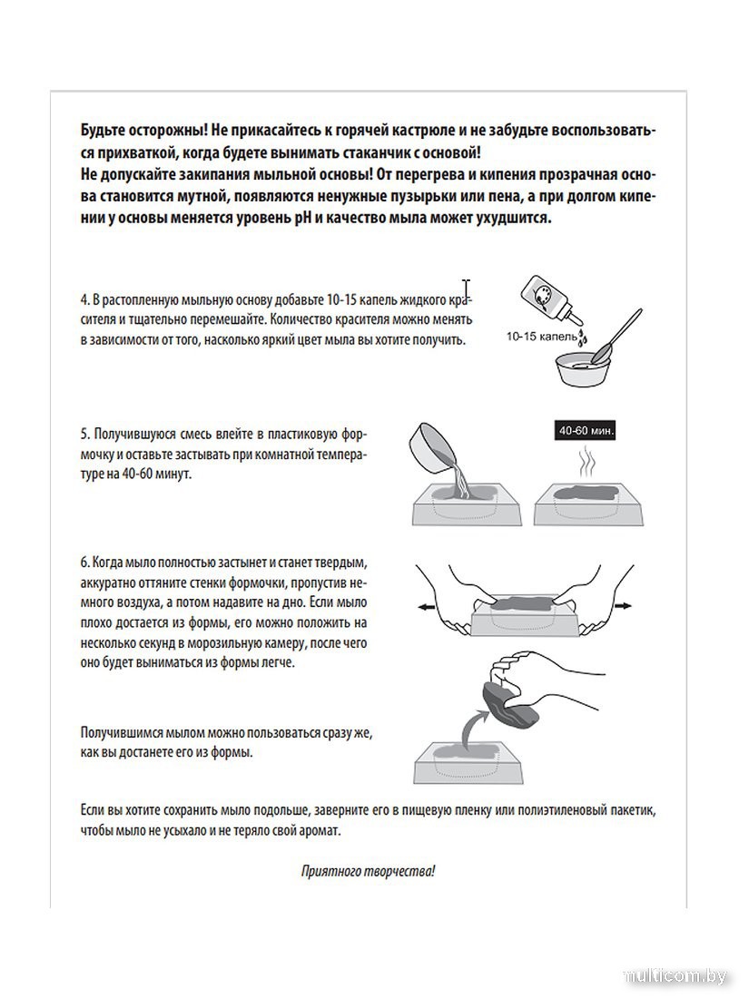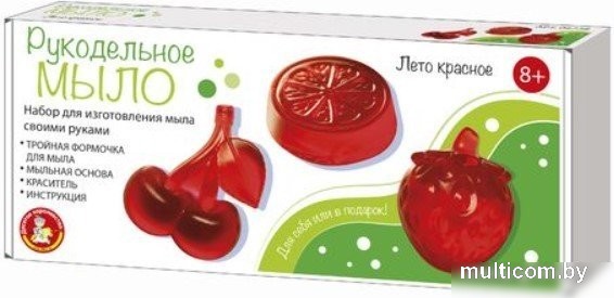 | Информация | Набор для изготовления мыла своими руками для детей «Лето красное» входит в серию наборов «Рукодельное мыло». С помощью этого набора для творчества ребенок сможет своими руками создать сразу 3 ярких и красивых кусочка фигурного мыла в виде летних ягод и фруктов, размером не более 8 см по 25 гр.. Для этого потребуется внимание, ответственность и соблюдение инструкции, что вполне по силам детям от 8-ми лет и старше, а единственным ограничением является контроль со стороны взрослых. |
