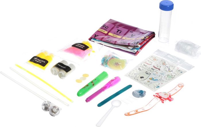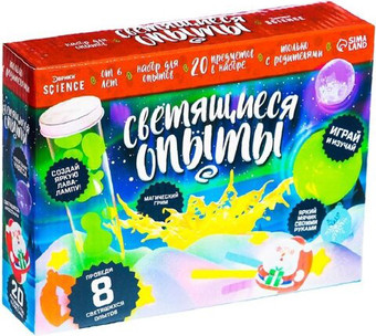 | Состав набора | Список опытов: - Сверкающая лава-лампа. - Сказочная ёлочка. - Мигающий попрыгунчик. - Удивительные чернила. - Волшебная палочка. - Магический грим. - Новогодние игрушки. - Неоновые татуировки. |