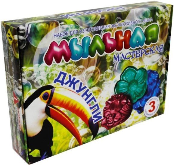 | Состав набора | - 3 стаканчика с мыльной основой,- натуральные ароматизаторы,- натуральные пищевые красители,- керамическую чашу для растапливания мыла,- защитные перчатки,- деревянные палочки,- 3 формочки для мыла |