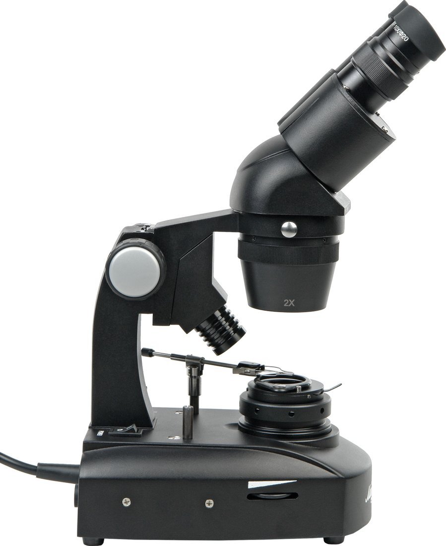 | Состав набора | микроскоп с основанием, встроенными осветителями, блоком питания, штативом, механизмом фокусировки, оптической головкой с блоком объективов и окулярными тубусами; сменные окуляры; конденсор темного поля; вставки для предметного столика; ювелирный пинцет; пылезащитный чехол; руководство по эксплуатации. |