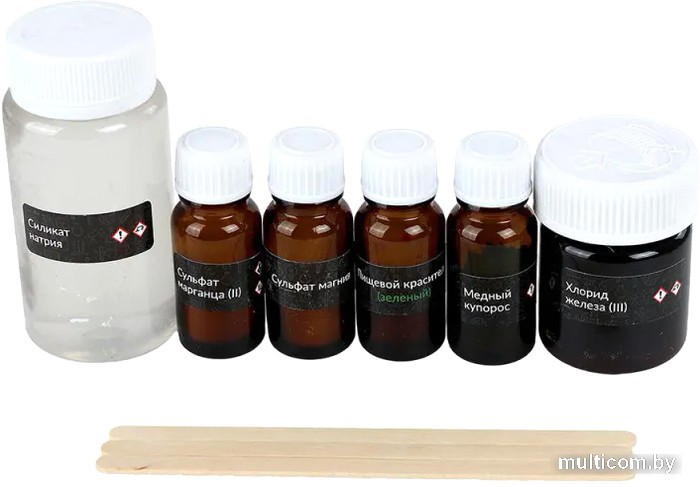 | Состав набора | Хлорид железа (III) - 10 гр. Медный купорос - 10 гр. Сульфат марганца (II) - 10 гр. Сульфат магния - 10 гр. Силикат натрия (раствор) - 100 мл. Одноразовый стакан - 4 шт. Палочка для размешивания - 3 шт. Пипетка Пастера - 1 шт. Пищевой краситель (зелёный) - 1,5 гр. Мерный стакан - 1 шт. Демонстрационный стакан - 1 шт. Перчатки - 1 пара. Инструкция. |