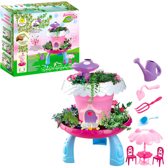 | Состав набора | цветочных вазона 2 шт подставка уличных фонарика 2 шт стульчика 2 шт грибочек лейка садовых инструмента 4 шт разделителя 3 шт пакетик с семенами брикета с землей 2 шт |