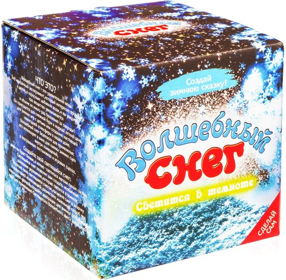 | Состав набора | снег 40 г, люминофор, пластиковый стакан, мерная ложка, палочка для размешивания, цветная инструкция на русском языке |