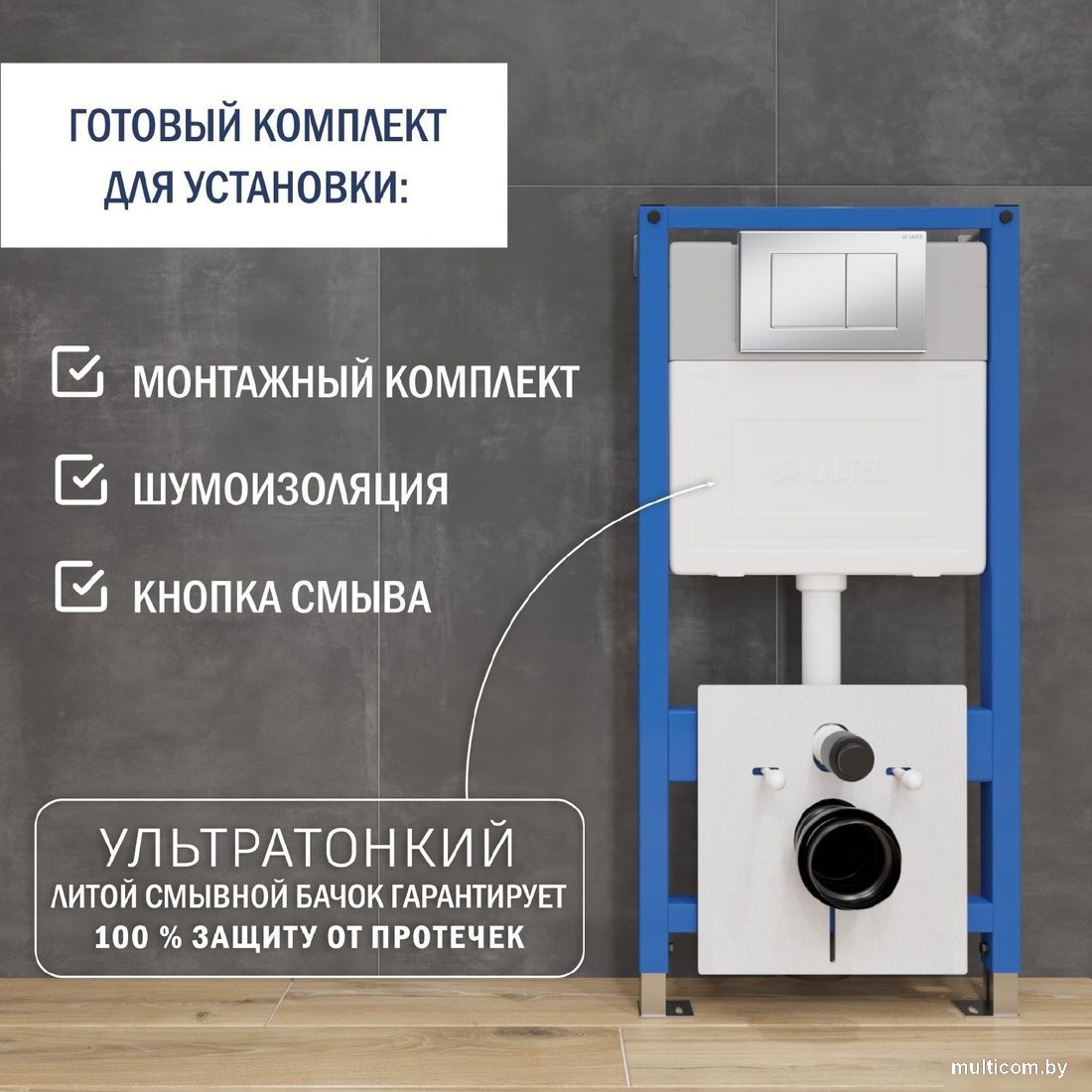 | Информация | - Инсталляция Lauter — товар европейского качества. - Рама инсталляции выполнена из стали и покрыта специальной краской для защиты от коррозии. - При помощи регулируемых ножек можно менять высоту расположения сантехники, подстраивая её под габариты помещения. - Бачок, входящий в состав инсталляции, полностью изолирован, что предотвращает образование конденсата на стенках. - Для простоты обслуживания, доступ к коммуникациям осуществляется через ревизионное отверстие клавиши. - Кнопка инсталляции – это инструмент, с помощью которого сливается вода из скрытого бачка подвесного унитаза. - Существует несколько видов, отличие которых заключается в разности механизмов, наборе функций и цене. - Немалую роль при их выборе играет внешний вид, цвет, материал изготовления. - Панель Lauter олицетворяет ненавязчивую и безотказную работу, несравненное удобство и долговечность. - Механическое управление самый применяемый, недорогой и простой вариант – срабатывает от простого нажатия кнопки. - Кнопка смыва Lauter оснащена двумя кнопками, это позволяет пользователю выбирать, какой объем воды будет сливаться, что оптимизирует коммунальные расходы. - Клавиша Lauter выполнена из высококачественного пластика. - Благодаря специальному покрытию на кнопке не остаются следы пальцев. |
