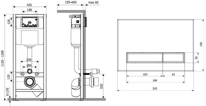 крепление на капитальную стену/на пол/на некапитальную стену, макс. нагрузка 400 кг, однорежимный/двухрежимный/трехрежимный/прерываемый слив, механическое управление, бачок в комплекте, 42.5x129x45 см
