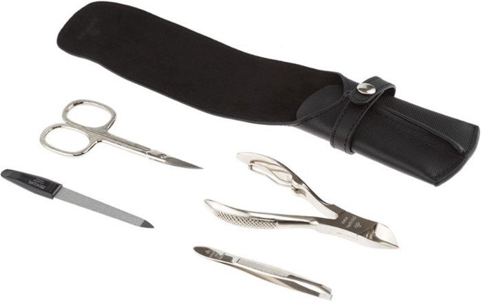 | Комплектация | •ножницы маникюрные — углеродистая сталь, никелированное покрытие, 9 см. •кусачки для ногтей — нержавеющая сталь, никелированное покрытие, 10,5 см. •пилка металлическая — углеродистая сталь, хромированное покрытие, 9 см. •пинцет скошенный — нержавеющая сталь, никелированное покрытие, 8 см. |