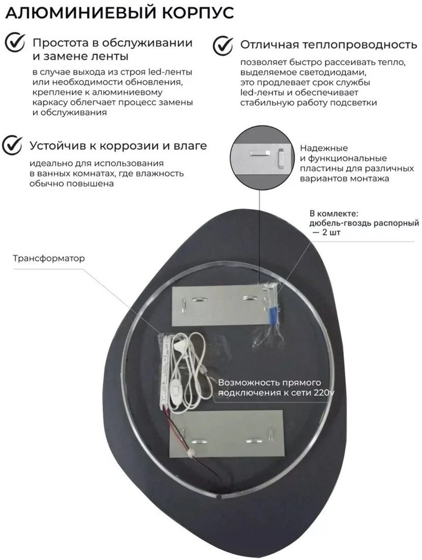 | Информация | - Ассиметричное зеркало с парящей подсветкой — необычное и интересное решение для любого интерьера. - Оно сделает пространство более живым и оригинальным, а подсветка добавит уюта и функциональности. - Зеркало оснащено сенсорным включением, реагирующим на движение. - Чтобы включить подсветку, необходимо сделать движение рукой со стороны сенсора. - Цвет подсветки 4000К (дневной белый). - Задний алюминиевый каркас для крепления светодиодной ленты является отличным способом отвода тепла. - Это спасает светодиоды от перегрева, а значит в разы продлевает срок их службы. - Важным преимуществом зеркала является его низкое энергопотребление. - Влагостойкое зеркальное полотно со шлифованной кромкой AGC-Premium не искажает и не затемняет отражение. - Изделие укомплектовано прочными креплениями и готово к монтажу. |