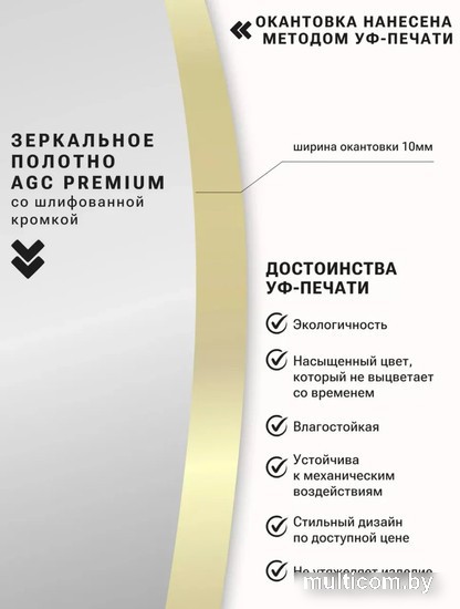 | Информация | Матовая окантовка выполнена методом УФ-печати, для нанесения которой мы используем экологически чистые материалы устойчивые к влаге. Влагостойкое зеркальное полотно со шлифованной кромкой AGC-Premium не искажает и не затемняет отражение. Изделие укомплектовано прочными креплениями и готово к монтажу. |