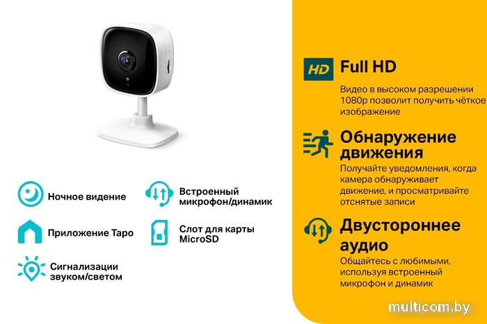 | Информация | ? Видео в высоком разрешении 1080p ? Ночное видение на расстоянии до 9 метров ? Push-уведомления на смартфон при обнаружении движения ? Звуковая и световая сигнализация для незваных гостей ? Встроенный микрофон и динамик ? Хранение до 128 ГБ на карте microSD – приблизительно 384 часа материала ? Простая настройка и управление с помощью приложения Tapo |