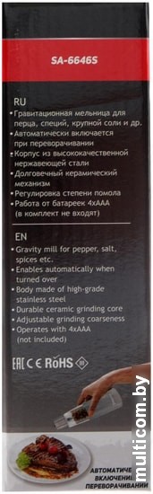 | Информация | Гравитационная мельница для перца, специй, крупной соли и др.;Автоматически включается при переворачивании;Керамический механизм;Регулировка степени помола;Работа от батареек: 4xAAA (в комплект не входят). |
