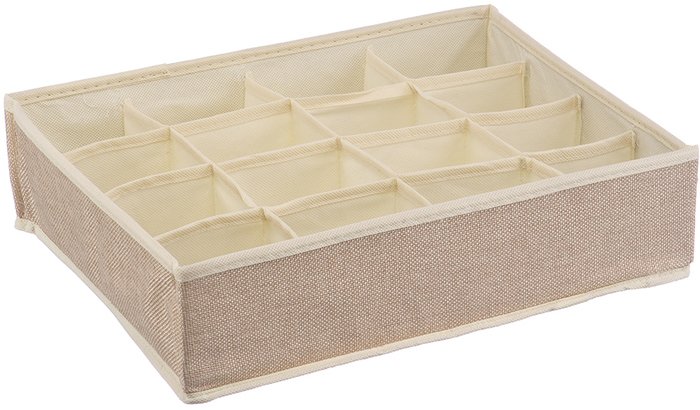 | Информация | Короб - органайзер с 16 секциями выполнен из нетканого материала. Подходит для хранения нижнего белья, галстуков, аксессуаров и т.д. Конструкция короба складная, поэтому в сложенном виде он занимает минимум места. Соберите всю коллекцию и наслаждайтесь аккуратностью и эстетикой своего гардероба. |