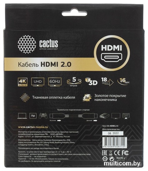| Информация | ??Текст описания составлен при помощи искусственного интеллекта. ? Кабель CACTUS HDMI - HDMI CS-HDMI.2-5 HDMI обеспечивает передачу видео и аудио с высоким качеством. ? Изготовлен с оплеткой из нейлона, что делает его прочным и надежным. ? Разъемы HDMI обеспечивают стабильное соединение и передачу сигнала без помех. ? Версия HDMI 2.0 гарантирует совместимость с современными устройствами. ? Кабель предназначен для использования с компьютером и av-аппаратурой. ? Длина кабеля 5 метров обеспечивает удобство в использовании. ? Одинаковый разъем с двух сторон (M-M) делает его универсальным и удобным в эксплуатации. |