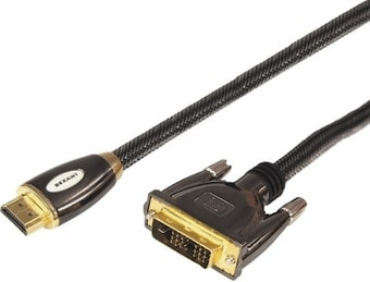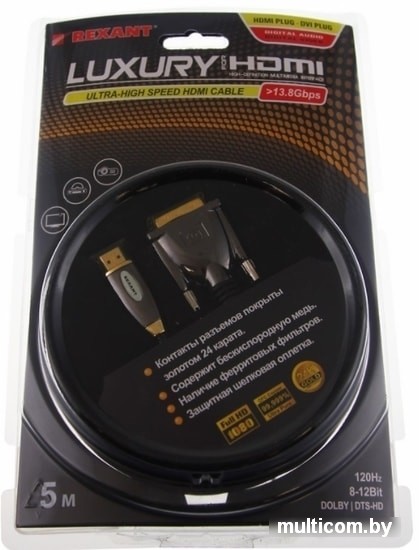 Информация | Шнур Luxury HDMI - DVI-D gold 5 м шелк золото 24к с фильтрами (блистер) REXANT предназначен для передачи цифрового видеоизображения высокого разрешения и многоканального аудиосигнала. Используется для совместной работы устройств, имеющих разъемы DVI-D и HDMI: проекторы, телевизионные аппараты, компьютеры и ноутбуки, мультимедийные проигрыватели и других видеоустройствах. С одной стороны располагается штекер разъема HDMI (High-Definition Multimedia Interface — интерфейс для мультимедиа высокой четкости), а с другой — штекер разъема DVI (Digital Visual Interface, сокр. DVI (англ. цифровой видеоинтерфейс)).Проводники кабеля изготовлены из бескислородной высокоочищенной меди (99 %) для передачи сигнала максимального качества. Шнур имеет ферритовые фильтры, служащие в качестве дополнительной внешней защиты от электромагнитных волн, что гарантирует воспроизведение оригинального сигнала. На контакты разъемов нанесен слой золота 24 карата по технологии вакуумного напыления, обеспечивающий повышение качественных показателей изображения и звука, а также отсутствие помех при передаче сигналов.В состав оплетки шнура входит шелк, что делает его прочнее и удобнее в эксплуатации. Длина шнура составляет 5 метров.Для бережной транспортировки и защиты от загрязнений предусмотрена блистерная упаковка. |