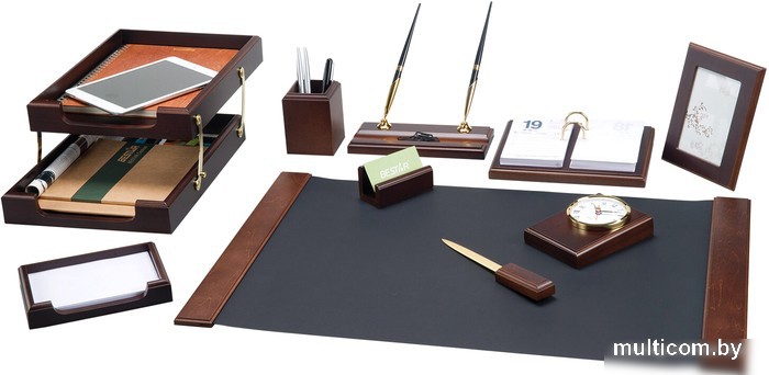 Информация | Настольный набор премиум-класса BESTAR «Artemis» — оригинальный подарок, отличающийся утонченным стилем и совершенством деталей. Набор состоит из 10 предметов: двойной лоток для бумаг, коврик для письма (размер — 60х42 см), подставка для ручек (2 шариковые ручки в комплекте), стакан-подставка для письменных принадлежностей, подставка для бумажного блока, подставка для визиток, нож для вскрытия конвертов, подставка для перекидного календаря, фоторамка, часы. Все предметы изготовлены из дерева красного цвета с золотистой фурнитурой. Набор упакован в подарочную коробку. |