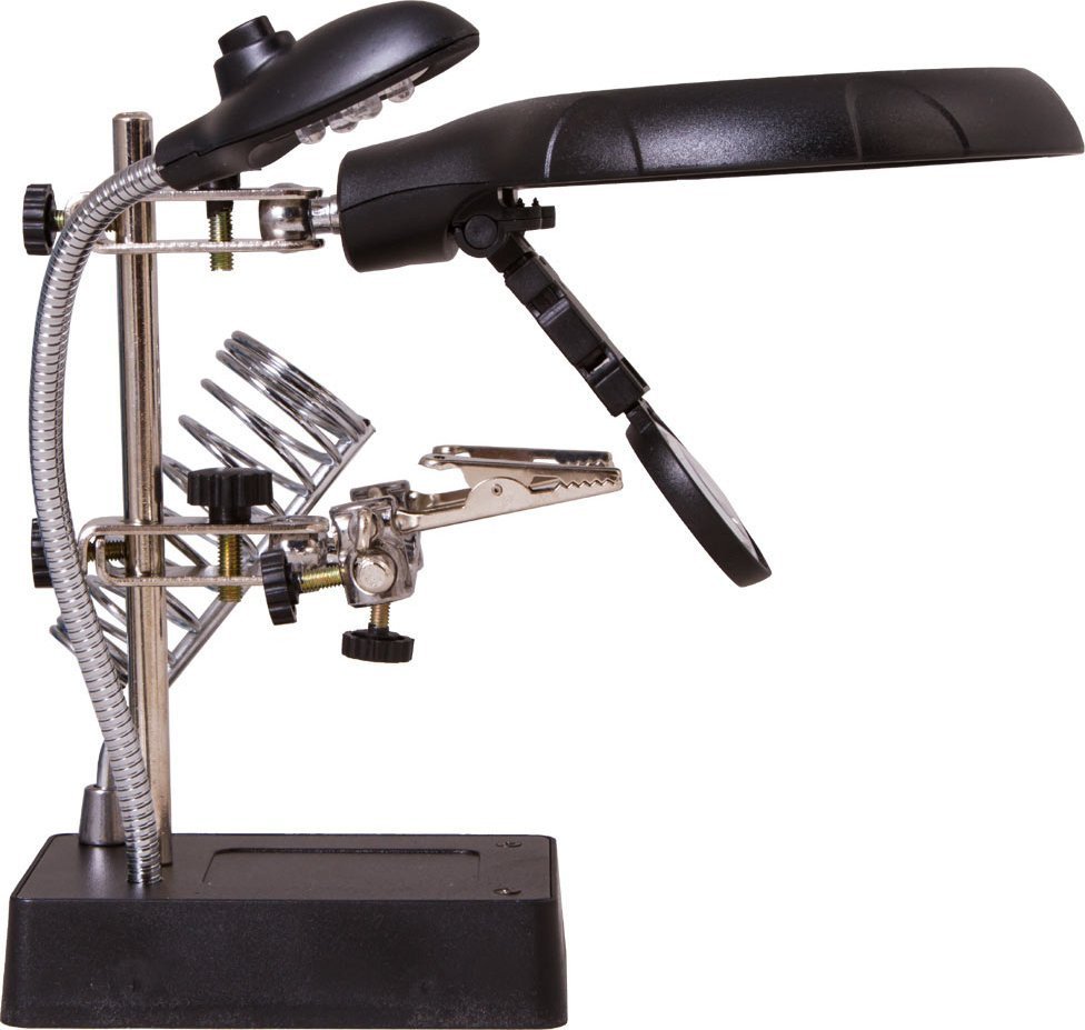 | Информация | - Настольная лупа Levenhuk Zeno Desk D11 – это идеальный помощник для любителей ручной работы. Она оснащена комбинируемыми линзами, светодиодной подсветкой на гибком штативе, держателями «третья рука» и креплением для инструментов. Подходит для ювелиров, электротехников, часовых мастеров и моделистов. - Линзы диаметром 90 и 34 мм обеспечивают увеличение до 10 крат. Обе линзы установлены на вертикальном штативе с возможностью регулировки расстояния до рабочей поверхности. Светодиодная подсветка, состоящая из 5 белых светодиодов, удобно направляется на нужную область благодаря гибкому держателю. Питание подсветки осуществляется от сети или батареек. - Держатели «третья рука» позволяют надежно фиксировать мелкие детали, что делает работу более комфортной и продолжительной. Также предусмотрен дополнительный держатель для паяльника или других инструментов, который можно при необходимости снять. - Обратите внимание, что напряжение сети в России и большинстве европейских стран составляет 220–240 В. Для использования устройства в странах с другим стандартом напряжения обязательно используйте соответствующий конвертер. |