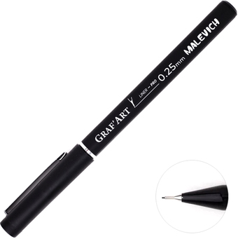 Информация | Капиллярные ручки (линеры) Малевичъ "Graf'Art PRO" это - профессиональные инструменты для письма, черчения и рисования, имеющий современный дизайн корпуса, удлинённый пишущий узел и эргономичную гладкую зону захвата, которую удобно держать в руке. В ручках используются специальные водостойкие архивные чернила с высокой степенью светостойкости и глубоким черным цветом. Рисунок после высыхания не размывается водой, и, за счет этого, линеры можно использовать в смешанной технике с акварелью, акрилом или гуашью. Пишущий узел: 0.25 мм. |
