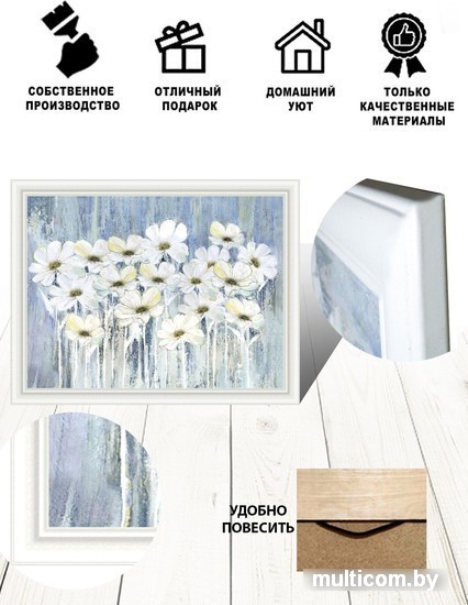 | Информация | Картина — важный элемент современного декора на стену, который привносит в интерьер помещения особую атмосферу уюта и тепла. Картина в рамке — отличный подарок на день рождения, новый год, свадьбу, новоселье. Сама картина (репродукция) напечатана на дизайнерской бумаге с фактурой холст и наклеена на твёрдую основу ДВП. Рамка (рама) для картины изготовлена из багета и подобрана дизайнером исходя из темы сюжета, цветов, размера так, чтобы оптимально вписаться в интерьер спальни, кухни, прихожей, детской, офиса. Размер сюжета картины 60х80 см. Ширина багета рамы 0.5 см, высота — 3 см. Размер картины в раме 61х81х3 см. |