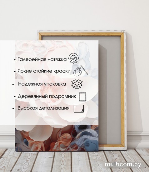 | Информация | ? Современная интерьерная иллюстрация с эффектом глубины и объема ? Подходит для больших пространств ? Яркие и насыщенные цвета ? Качественная краска и профессиональное исполнение ? Натуральный, сатиновый холст ? Деревянный подрамник с бортиком ? Галерейная натяжка |