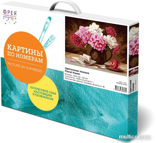 | Комплектация | Акриловые краски, Держатель для готовой работы, Кисти, Контрольный лист, Холст на подрамнике |