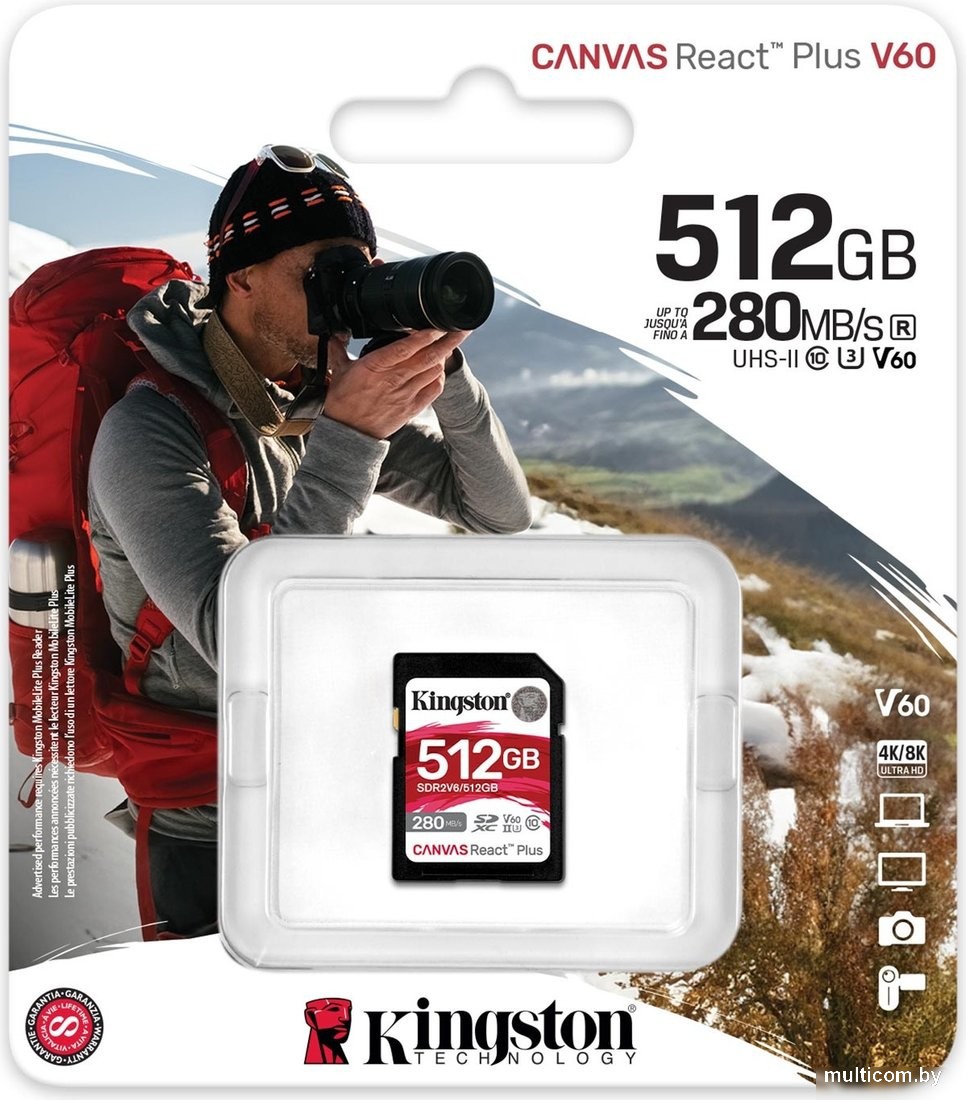 | Информация | Карта памяти Kingston Canvas React Plus SD разработана специально для фотолюбителей начального уровня. Она поддерживает стандарт UHS-II, дополняя стандартные камеры UHS-II, используемые начинающими фотографами, снимающими 4K с более высокой частотой кадров в секунду (fps), чем UHS-I. Эта карта может похвастаться классами скорости U3 и V60, а так же скоростью передачи данных до 280 МБ/с и емкостью до 1 ТБ. Попрощайтесь с медленной скоростью и выпадением кадров. В вашем творческом процессе больше не будет места этим проблемам, а рабочий процесс будет плавным и эффективным. |